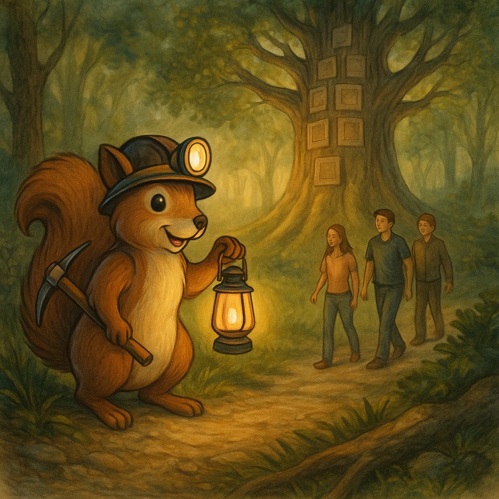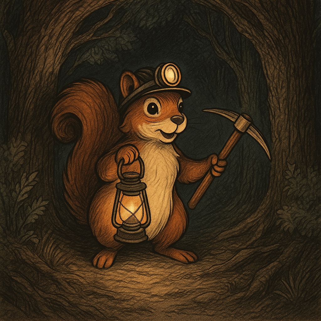 Out from the forest scurried a little figure with bright eyes, a miner’s lamp, and a pickaxe in hand: Satoshi Squirrel.